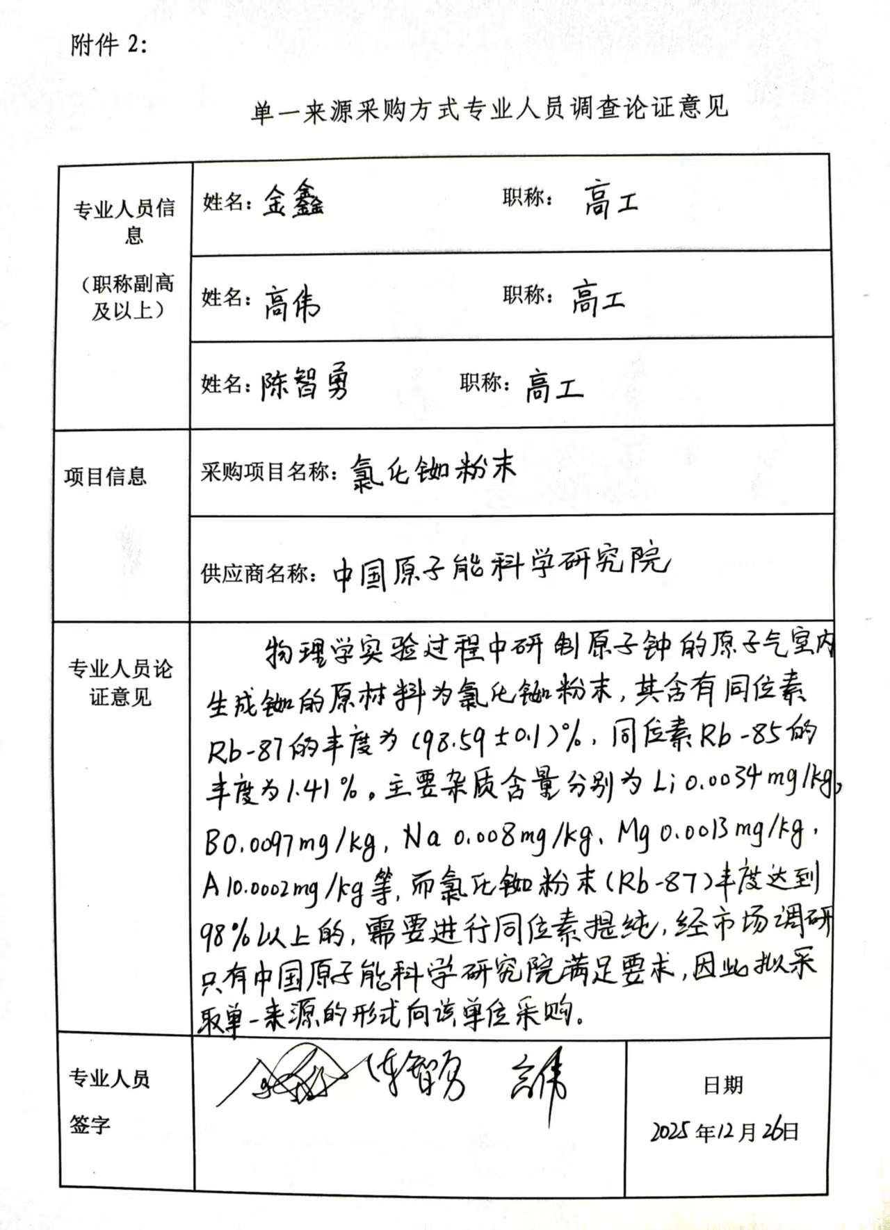 中国科学院精密测量科学与技术创新研究院关于向中国原子能科学研究院采购氯化铷粉末单一来源采购公示