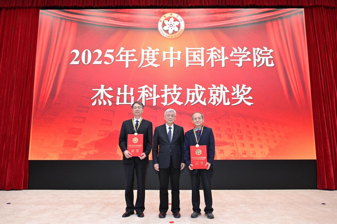 侯建国为获得2025年度中国科学院杰出科技成就奖个人成就奖的周向宇、丁抗颁奖